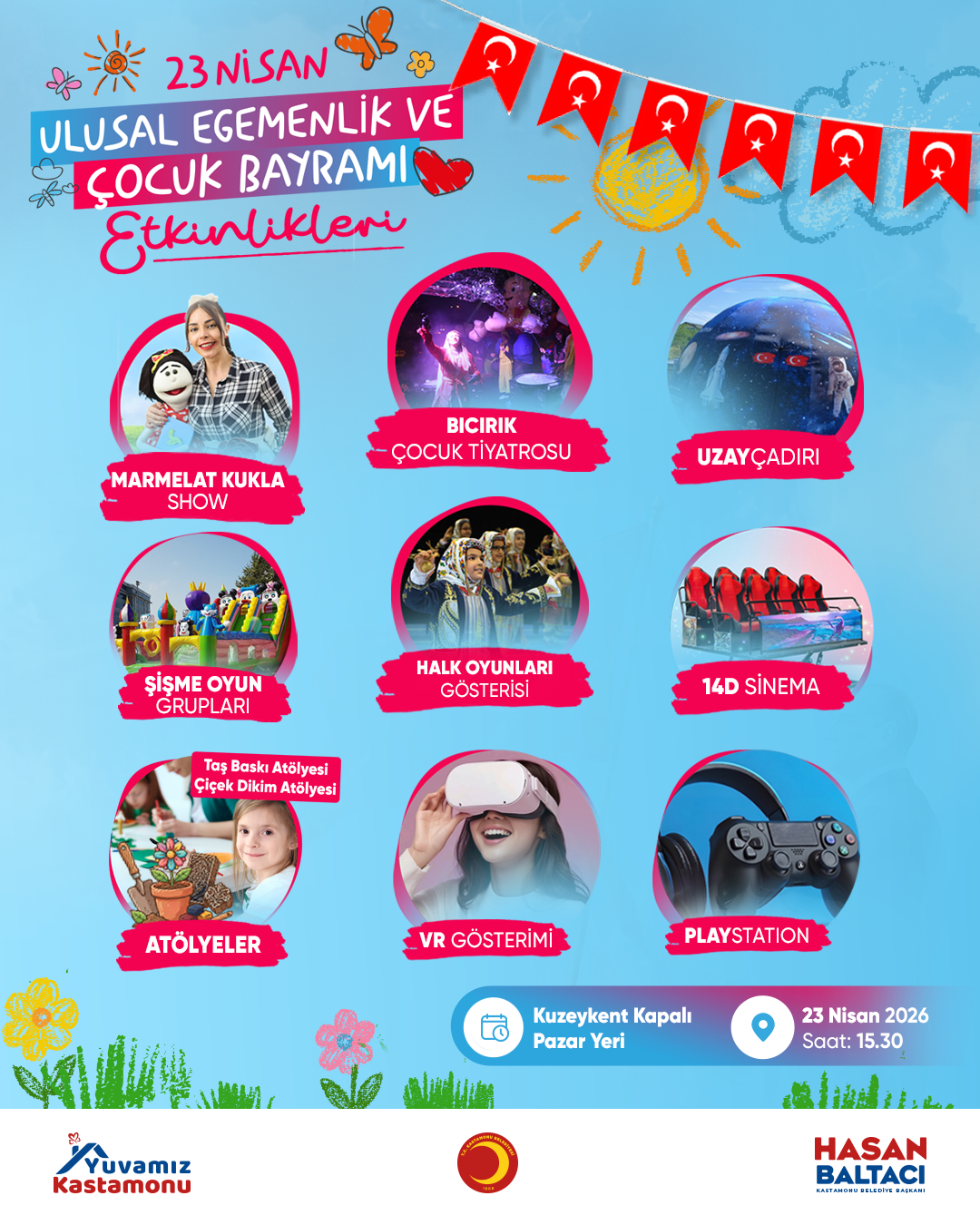 Kastamonu Belediyesi tarafından 23 Nisan Ulusal Egemenlik ve Çocuk Bayramı kapsamında düzenlenen etkinliklerde çocuklar için birbirinden renkli aktiviteler hazırlandı. Program, bu Perşembe günü saat 15.30’da Kuzeykent Kapalı Pazar Alanı’nda gerçekleştirilecek.